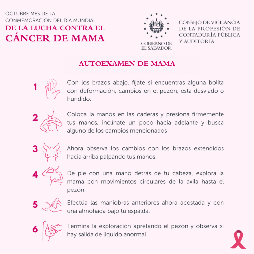 Se les invita a realizarse a todos los profesionales inscritos, asimismo al público en general, la autoexamen de mama, chequeos médicos, mamografía anual y si encuentran alguna alteración consultarlo inmediatamente con su médico.