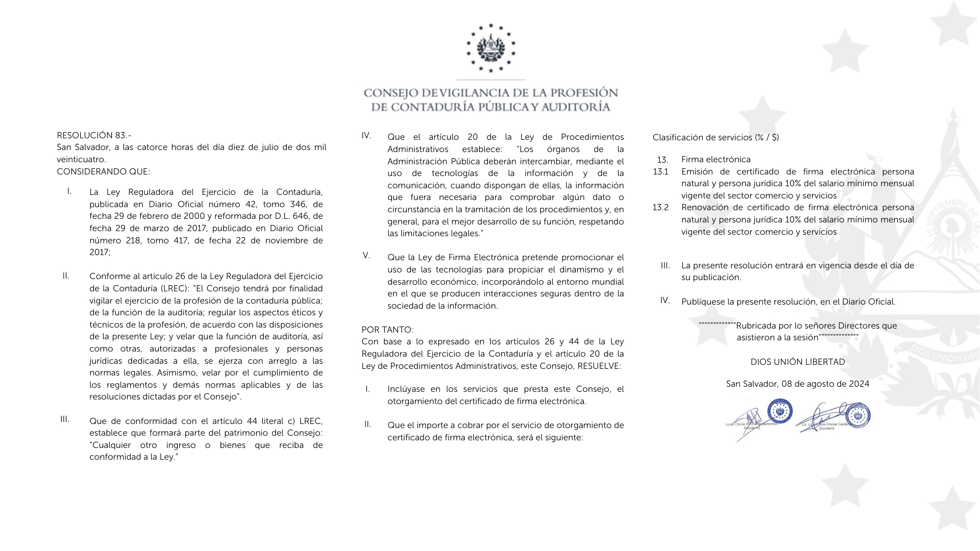 El Consejo de Vigilancia de la Profesión de Contaduría Pública y Auditoría, a través de la resolución N°83, incorpora el arancel para tramitar la firma electrónica certificada para auditores, contadores y sociedades de Contaduría Pública.