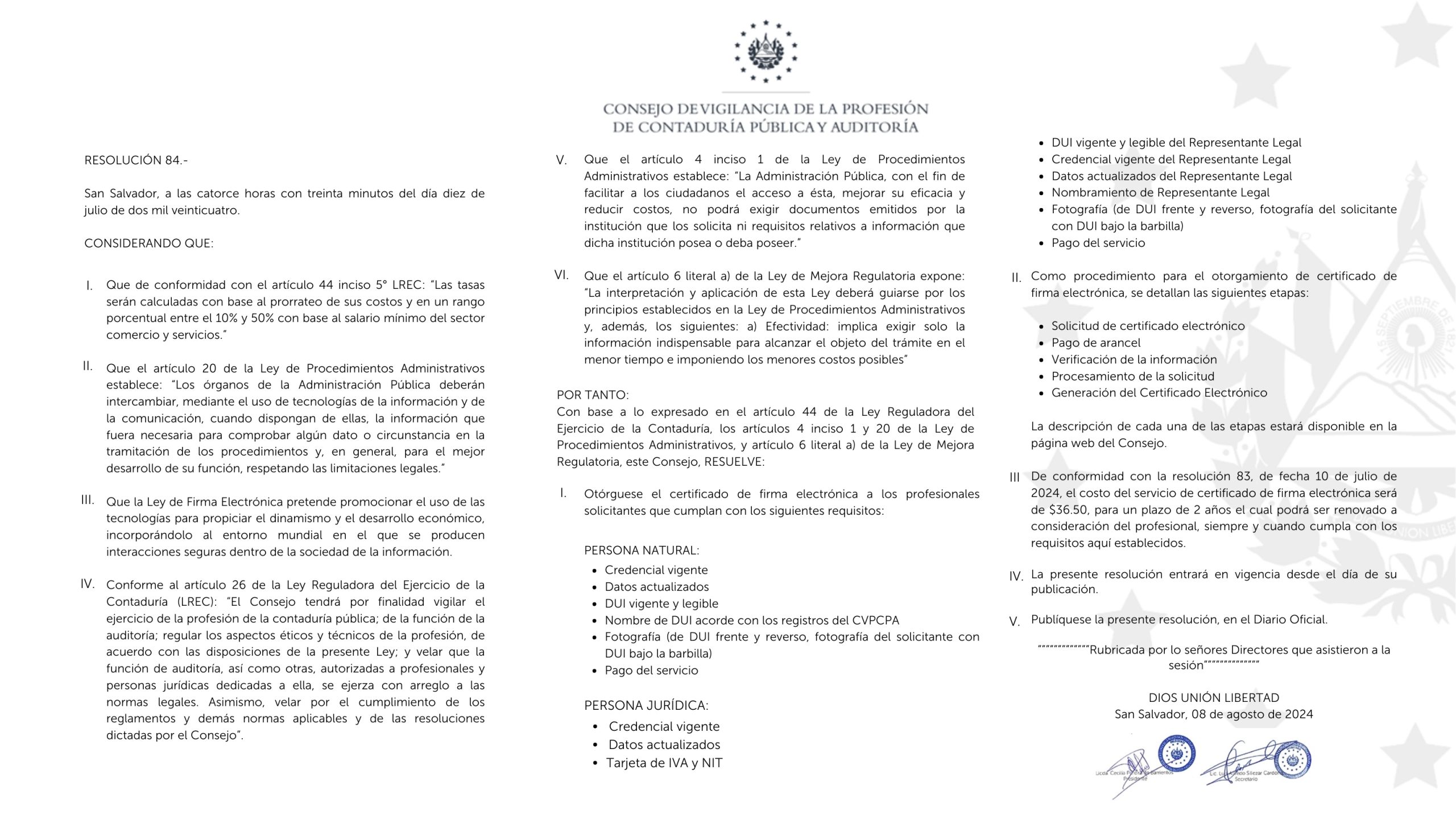 El Consejo de Vigilancia de la Profesión de Contaduría Pública y Auditoría emite resolución N°84 con los requisitos para solicitar la firma electrónica certificada para auditores, contadores y sociedades de Contaduría Pública.