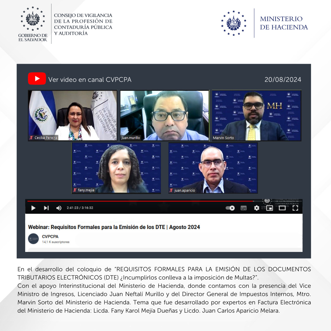 El día martes 20 de agosto de 2024, El Consejo de Vigilancia de la Profesión de Contaduría Pública y Auditoría, con el apoyo interinstitucional del Ministerio de Hacienda, desarrolló el Coloquio: