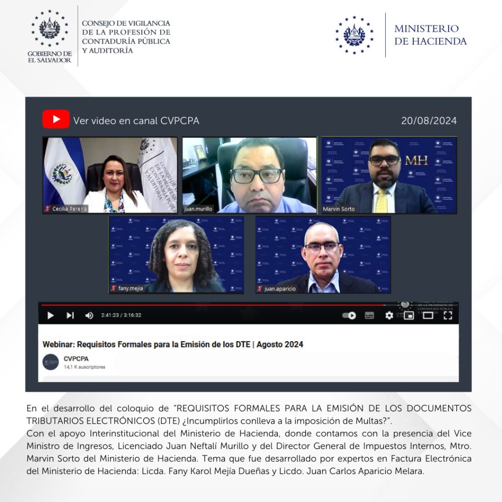 Contamos con la presencia del Viceministro de Ingresos Juan Neftalí Murillo y el Director de Impuestos Internos Mtro. Marvín Esau Sorto. quienes expresaron la importancia de comunicar a la población, aspectos relevantes observados, en todo el recorrido para poner en marcha la factura electrónica en El Salvador, lo que ha permitido identificar requisitos fundamentales y formales, que los usuarios deben conocer para la implementación y emisión; además exhortaron a los contadores, auditores y sector empresarial al cumplimento de la ley, aclarando entre otros aspectos que el correo electrónico no es el único medio para recibir un DTE, sino también a través de mensaje de texto, código QR, entre otros.