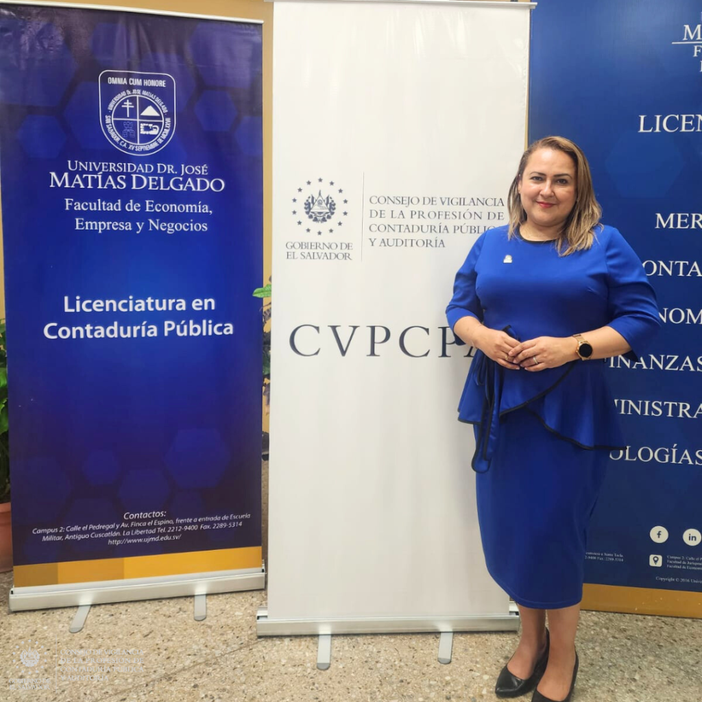 La presidenta del Consejo de Vigilancia de la Profesión de Contaduría Pública y Auditoría, Licda. Cecilia Carolina Pereira de Barrientos, participó en el evento académico “Convivio Contable 2025”, organizado por la Licenciatura en Contaduría Pública de la Universidad Dr. José Matías Delgado, el pasado miércoles 24 de septiembre de 2025, en las instalaciones de la Facultad de Economía y Negocios.